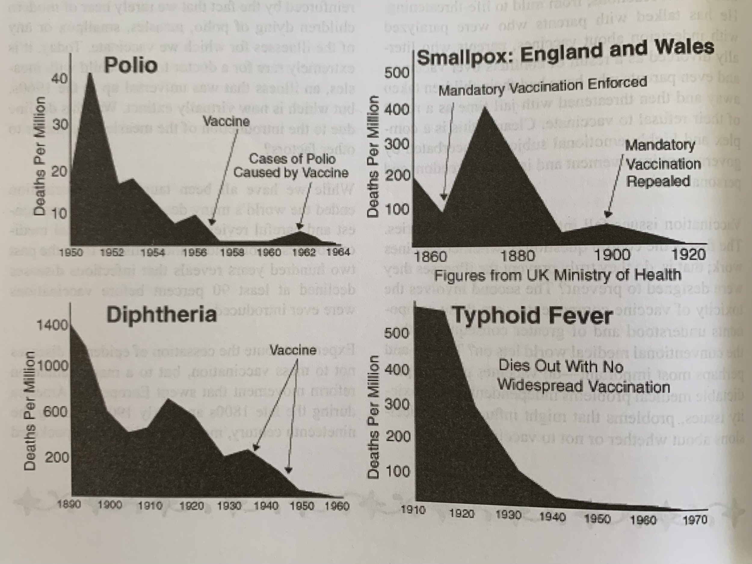 if you actually look at the decline of these diseases, you’ll see that they were already on a steep decline before each shot was introduced (except in the case of smallpox, which actually increased it’s cases after the shot was enforced). this decline is credited to new sanitary practices that were evolving! specifically clean water. and also important to note - they declined simultaneously in europe, who was not partaking in mass immunizations. outbreaks still can occur to this day, but always look a bit closer into where it originated, as it is almost always from someone who already had the immunization.